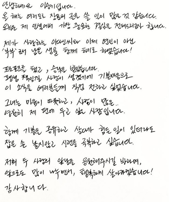 '제가 사랑하는 이다인씨와~' 라는 대목이 사랑꾼 이승기의 모습을 보여준다고 생각해요. 정말 너무 예쁜 선남선녀가 결혼을 한다고 하니 제가 다 흐뭇하네요. 이승기는 이다인과 공개 열애를 인정한건 2021년 5월이라 공개연애 한지 먁 2년만에 결혼이라는 결실을 맺게 된건데요, 이다인이 이승기의 할머니댁에 방문한 사진도 공개되기도 했어서 진지한 만남이겠구나 생각은 했었습니다. 일부 팬들은 이승기와 이다인의 만남을 반대하고 시위를 하기도 했었죠. 앞으로 이승기의 앞날엔 좋은 일만 가득했음 좋겠습니다.