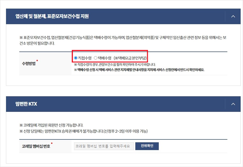 임산부 필수 영양제인 엽산제 및 철분제를 받기 위한 신청이었때문에 엽산제 및 철분제 신청을 했습니다. 여기서 직접 수령도 가능하고 택배 수령도 가능했는데요, 직접 수령은 보건소 방문해서 수령하는것이고, '의약품' 표기가 된 철분제를 받을 수 있고, 택배로 받는다고 하면 '건강기능식품'으로 표기 된 제품으로 영양제를 받는다고 합니다. 어떤 방법으로 수령할지 선택 한 뒤 신청을 이어 나갑니다.