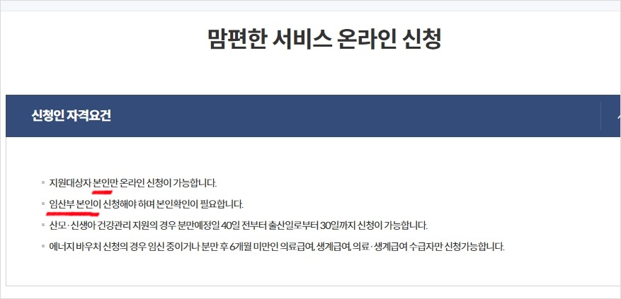 정부 24에서 지원하는 맘편한 서비스 온라인 신청란 입니다. 온라인으로 신청을 지원 대상자인 임산부 본인만 신청이 가능하고 본인 인증이 이루어져야 합니다.