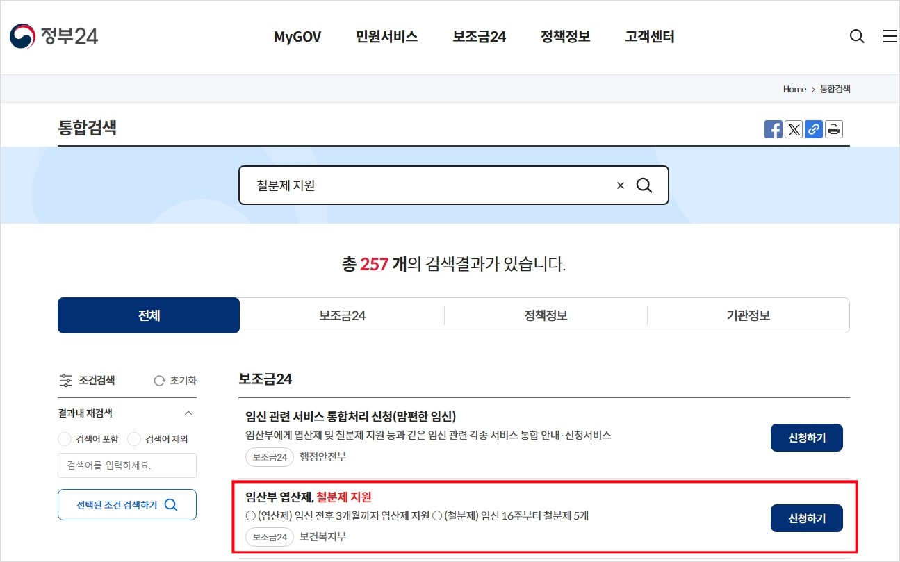 보건소에 방문해서 임산부 등록을 마쳤고 철분제 지원만 받으면 되는 상황이라 <철분제 지원>으로 검색하여 신청하기를 눌렀습니다. 임산부 철분제 지원은 임신 16주 부터 신청이 가능합니다.