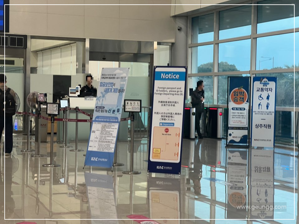 김포공항과는 다르게 제주공항 출국장은 한 곳이었고, 제일 오른쪽에 교통약자응 위한 검색대가 있었습니다. 이쪽으로 들어가서 김포공항에서 처럼 대기하지 않고 빠르게 보안검색대를 지나칠 수 있었습니다.