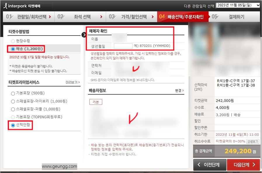 예매자 확인 부분에 본인의 이름을 확인 한뒤 신분증상의 생년월일을 기입하여 줍니다. 그다음에 [다음단계]를 눌러 결제를 진행해 주시면 됩니다.