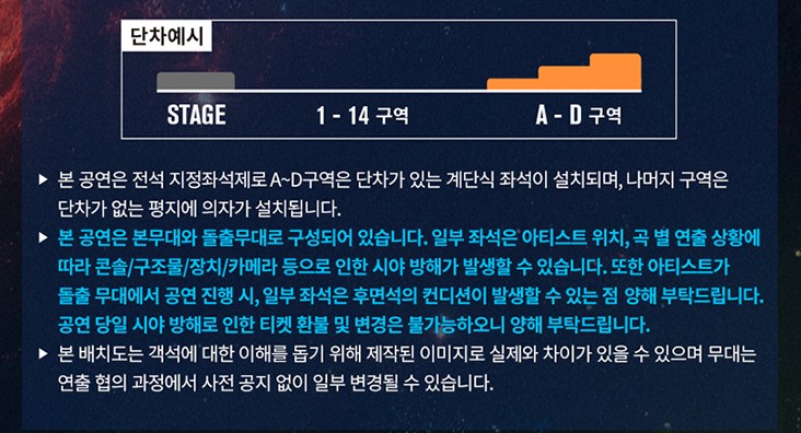 1번부터 14번까지인 VIP, SR, R석은 모두 단차가 없는 평지에 의자가 설치될 예정이며 S석은 A,B,C,D구역은 단차가 있는 계단석에 좌석이 설치될 예정이라고 합니다. 일부 좌석은 시야에 방해가 있을 수 있으니 이 점 또한 참고하시길 바랍니다.