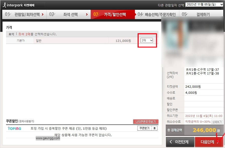 다음애서 제일 중요한 부분은, 네모박스 쳐진곳을 변경해 주는 것입니다. 처음에는 0매로 되어있으며, 내가 구매할 좌석의 수인 2매로 선택한 뒤 티켓금액과 수수료를 확인한 후 [다음단계]를 눌러줍니다.