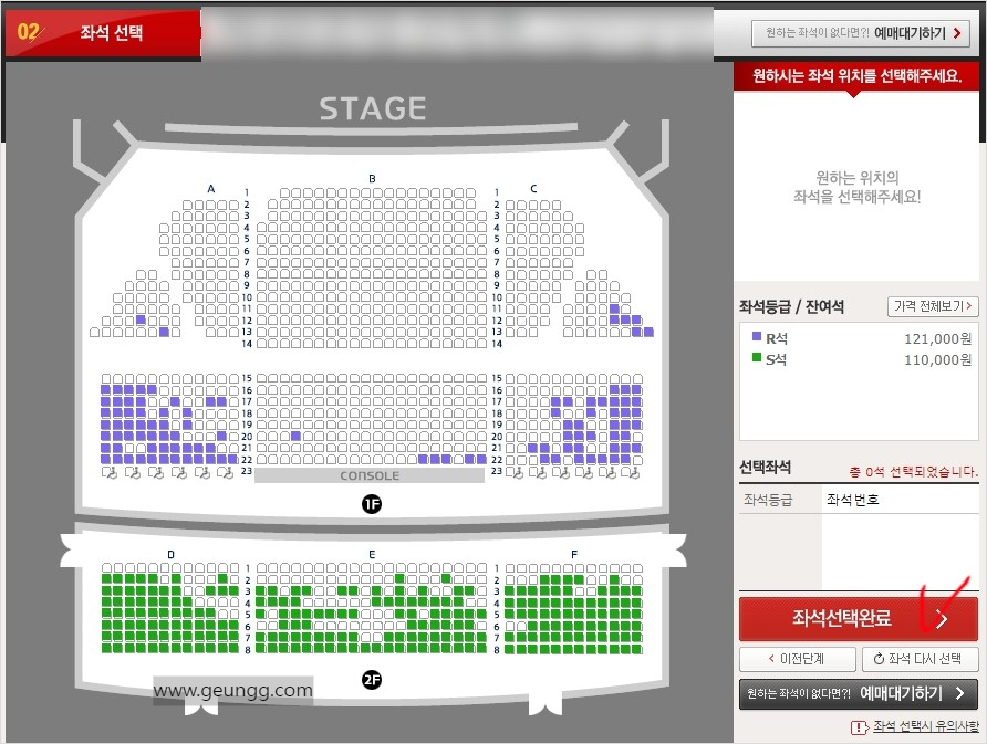 예매하기를 눌러 진입 하셨으면 빈좌석과 예매된 자석이 보일 건데요, 흰색의 좌석은 이미 예매가 완료된 좌석이며 포도알이라고도 불리는 보라색 좌석이 예매 가능한 좌석입니다. 고민하지 말고 보이는 대로 바로 선택하셔야 다른 사람에게 뺏기지 않고 예매하실 수 있습니다. 원하는 좌석의 자리를 선택한 후 [좌석선택완료]를 눌러주세요.