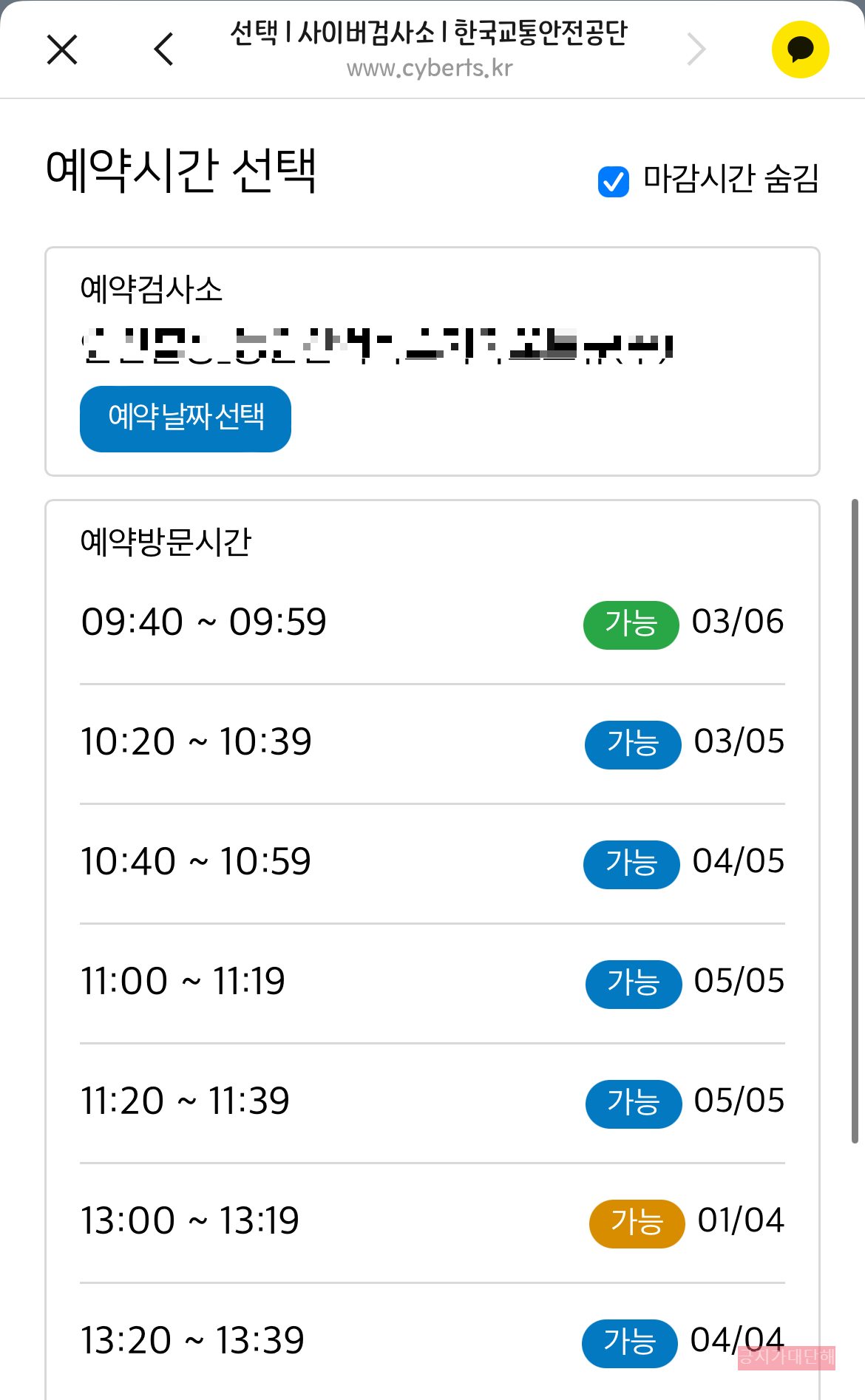 검사소를 선택했다면 방문할 시간대를 선택합니다. 시간대별로 검사 가능한 대수가 있으니 확인 하시고 선택하시길 바랍니다. 선택을 완료하시면 예약 정보를 다시 한번 확인합니다. 자동차번호, 차명, 핸드폰번호, 검사소, 방문일을 확인하여 수정하실 부분이 있으면 이전으로 돌아가 다시 선택하셔야 합니다.