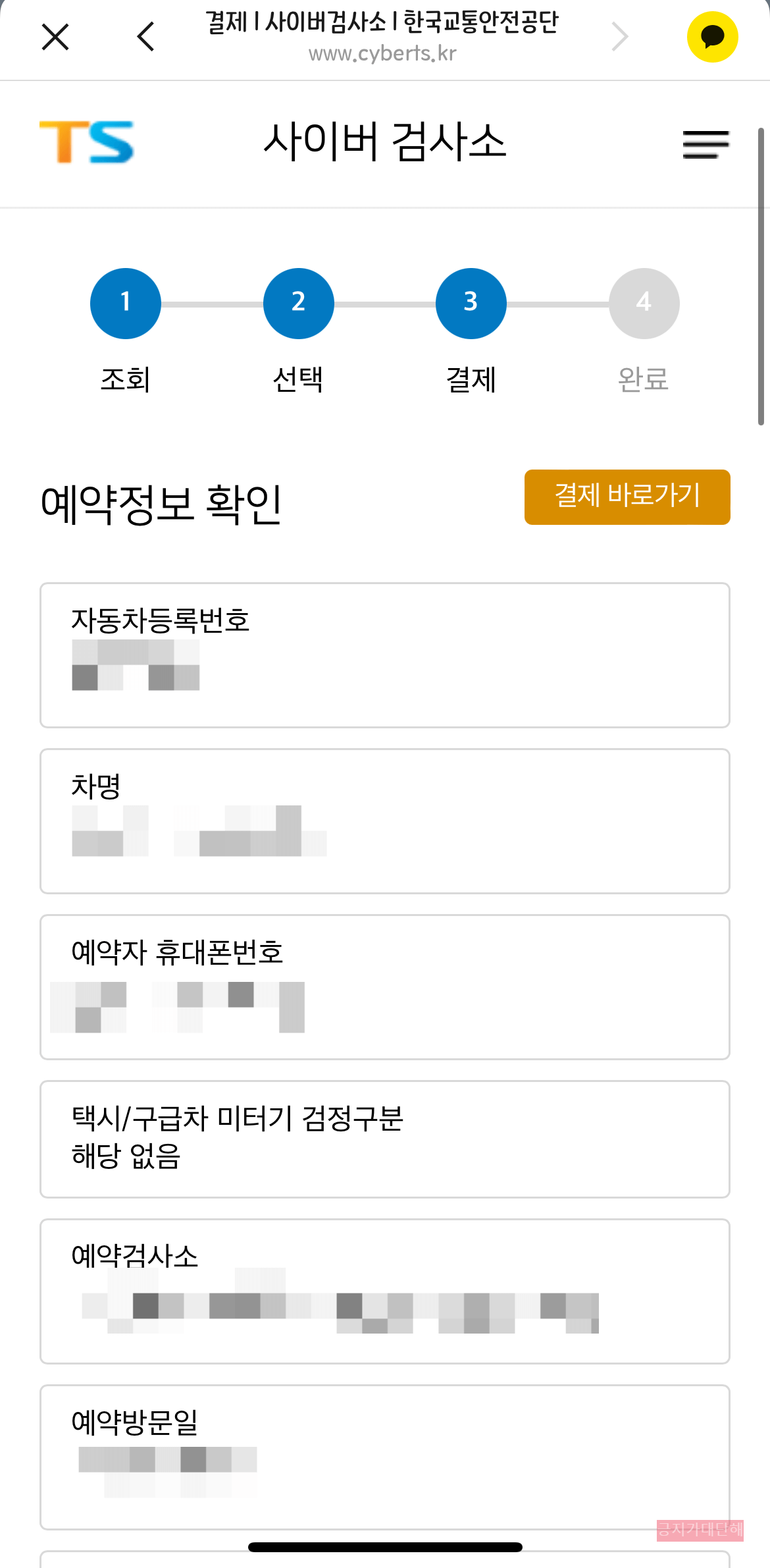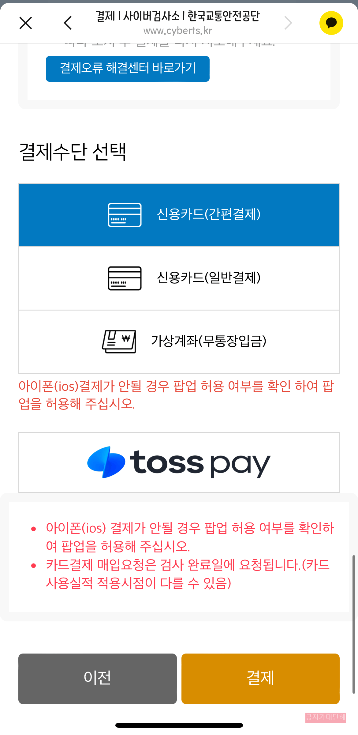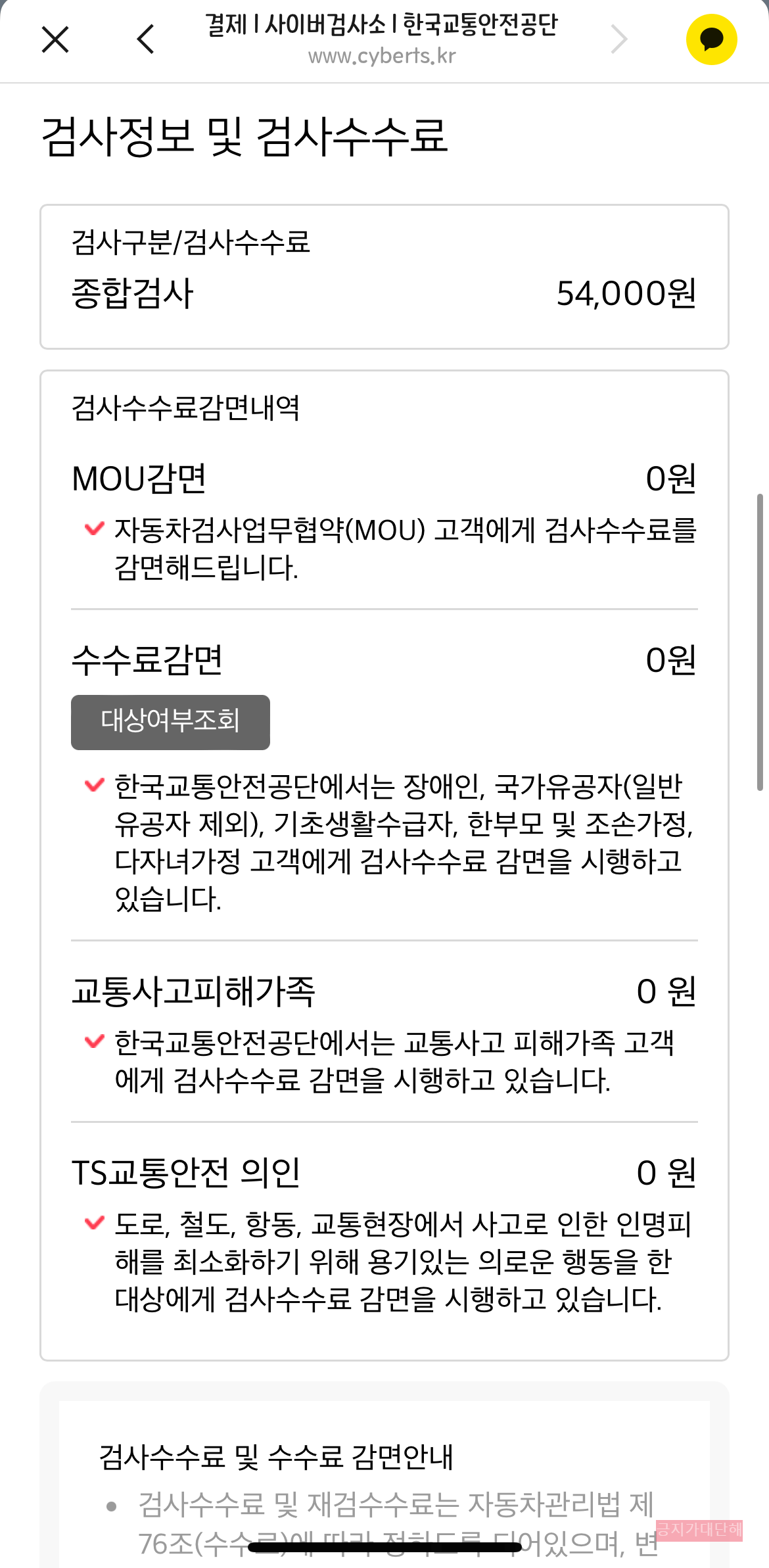 예약 정보를 확인하셨으면 자동차검사 검사료를 결제해야 합니다. 중형차 기준 종합검사 검사료는 54,000원입니다. 신용카드, 가상계좌 (무통장입금), 토스페이로 결제 가능합니다.