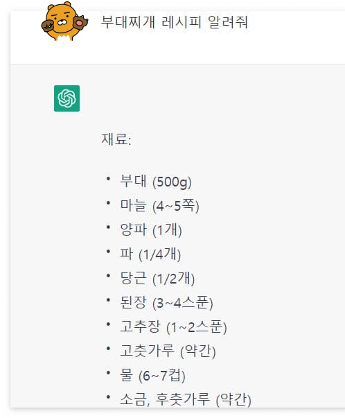 부대 찌개의 레시피를 알려달라는 저의 질문에 막힘없이 재료과 조리과정등을 알려주는 챗gpt ! 소소하게 이런저런 질문을 하면서 대화를 해보았는데 재밋더라고요. 영화추천해줘, 내일의 날씨 알려줘, 포토샵 단축키 알려줘 등등 궁금한게 있을때 챗gpt에게 물어보면 빠르게 답을 얻을 수 있겠습니다.