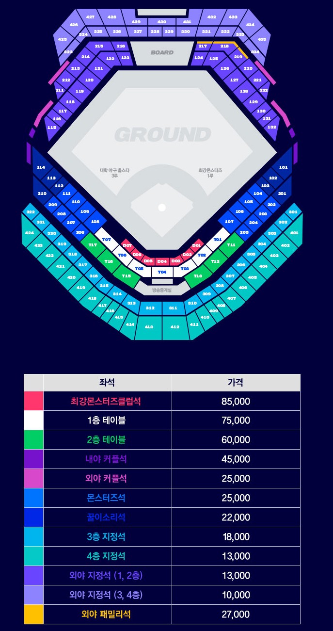 1루는 최강몬스터즈, 3루는 대학 야구 올스타입니다. 경기 관람에 시야가 좋은 몬스터즈석 가격은 25,000원이고 3층 지정석 18,000원, 4층 지정석 13,000원입니다. 고척 스카이돔 좌석 배치도를 첨부하오니 원하시는 좌석을 미리 염두해두시고 예매 전쟁에 뛰어드는 것도 방법일 것 같습니다.