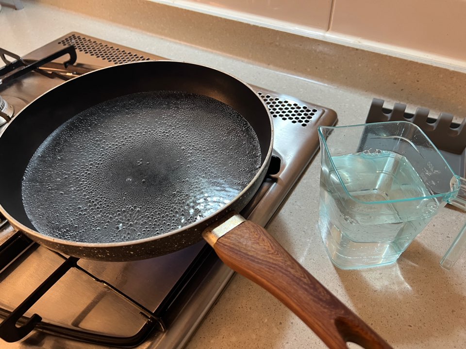 큰 팬에 꽤 넉넉한 양의 물을 부어 끓여줍니다. 그리고 냉수도 같이 준비해주세요.