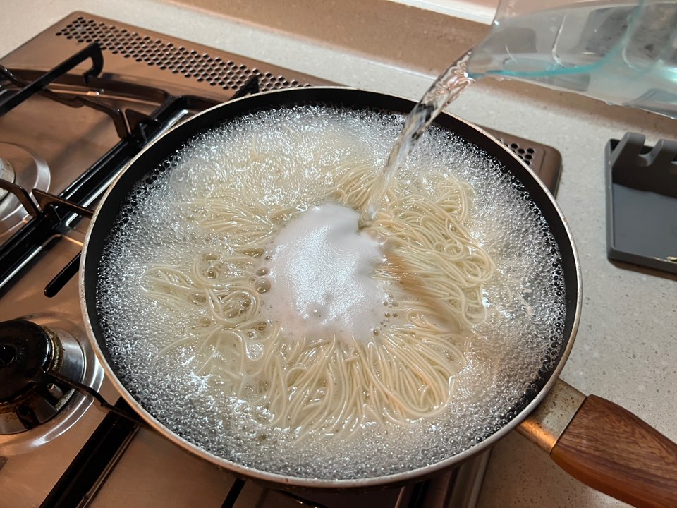 물이 팔팔 끓어오르면 소면을 넓게 펼치듯이 넣어줍니다. 겹쳐서 넣어주면 면이 붙을 위험이 있을 수 있습니다.