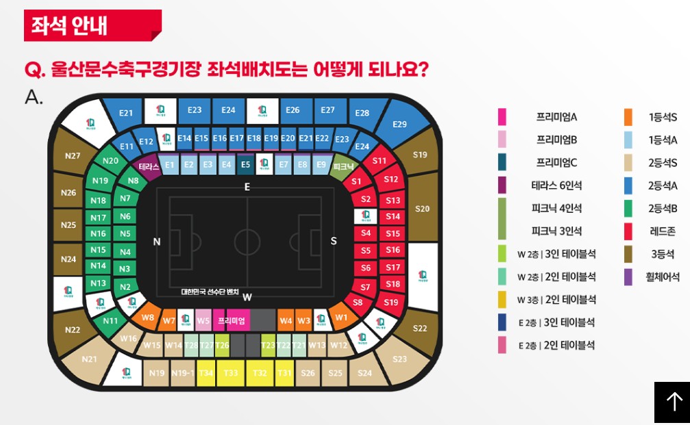 대한민국 대 콜롬비아 친선경기가 치뤄지는 울산문수축구경기장 좌석배치도 입니다. 명당 자리 추천으로는 대한민국 선수단 벤치가 있는곳 또는 E1,2,3,4,5,7,8,9나 W3,4,5,7 라인과 그 뒷줄까지 되겠습니다. S로 시작하는 레드석은 대한민국 대표팀을 서포팅 하는 응원단 붉은악마의 응원존입니다. 강한 응원의 현장 열기를 느끼고 싶으신 분들은 S석도 추천합니다.