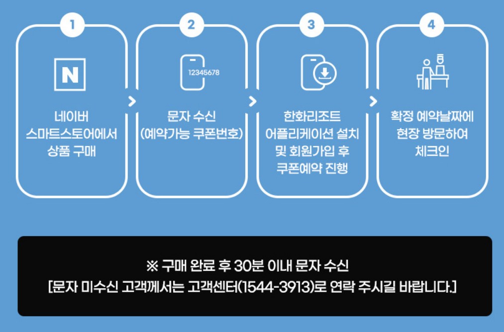 한화리조트 앱 설치가 필수입니다. 네이버 스마트스토어에서 원하는 지점 이용권을 구매한 뒤 예약 쿠폰번호를 지급받고, 한화 리조트 앱에 회원가입후 쿠폰을 이용하여 예약을 진행해야합니다.