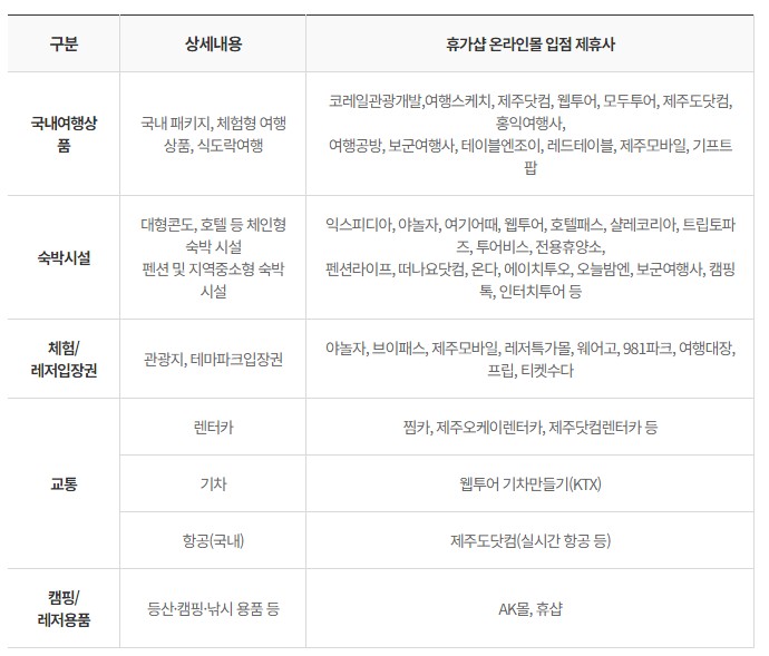 휴가샵의 제휴 업체로 국내여행상품, 숙박시설, 체험 입장권, 레저입장권, 렌터카, 기차, 항공, 캠핑용품, 레저용품 등 다양한 곳에서 사용할 수 있습니다.