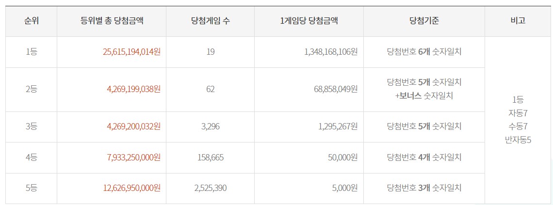 이번 1064회 1등의 당첨금액은 1,348,168,106원으로 총 19명입니다. 이 금액은 세전 금액이며 33%의 세금을 제하고 수령하게 됩니다. 19명의 당첨자 중 자동으로 구매해 당첨된 사람이 7명, 반자동이 5명이며 수동으로 구매한 1등 당첨자는 7명입니다. 2등의 당첨금은 68,858,049원으로 당첨자수는 62명입니다.