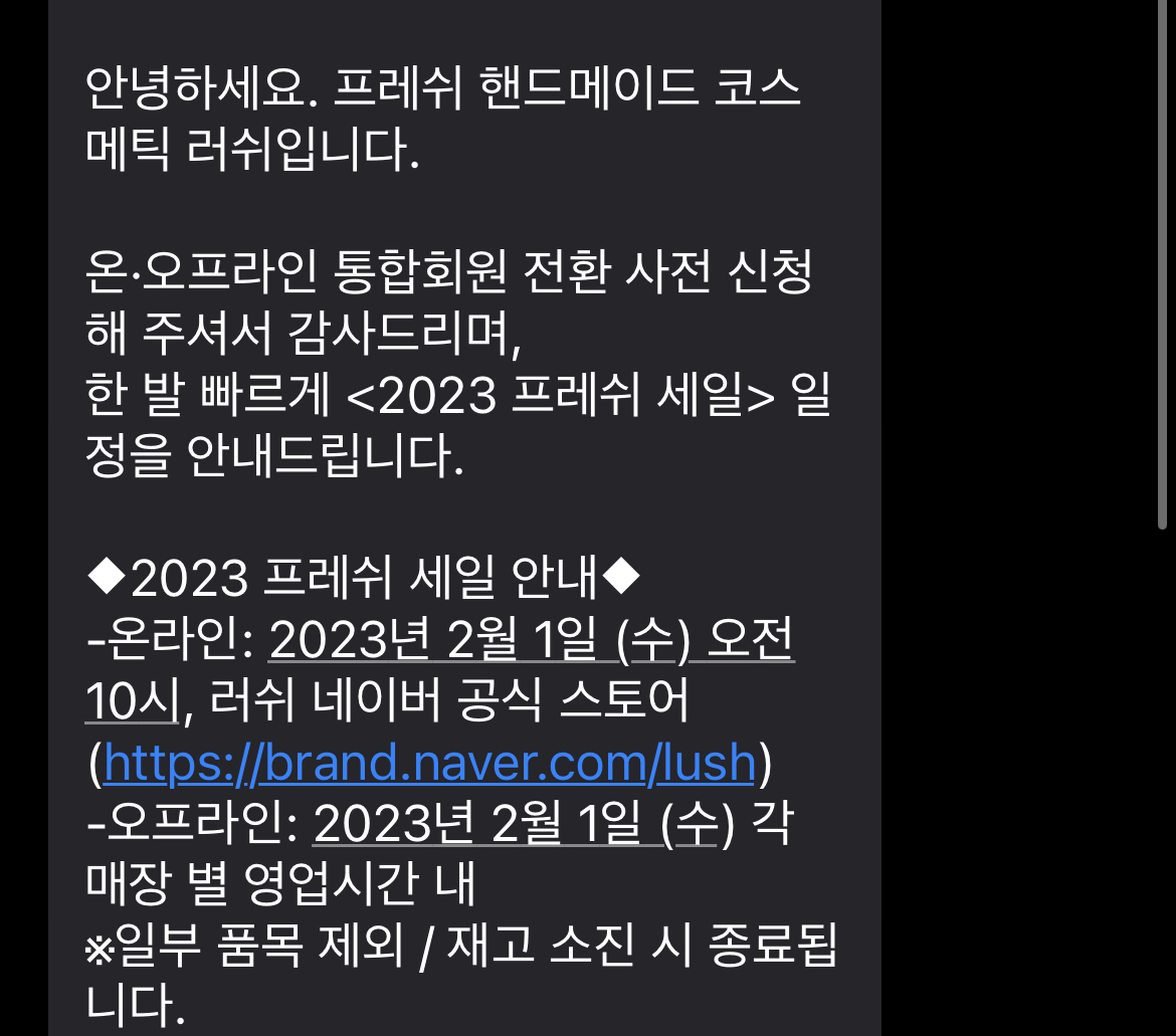 2023년 러쉬 세일은 2/1(수)로 추정하며 못해도 7일 이내에 시작이 될 것으로 예상합니다. 프레쉬 세일이 시작되면 당일 오전 10시 공식홈페이지에 정보가 올라온다고 하니 러쉬 홈페이지를 주시하시면 도움이 될 것 같습니다.