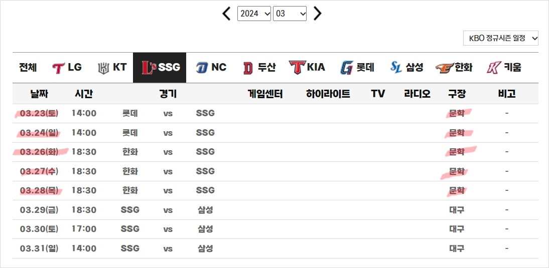 2024년도 SSG 랜더스 경기일정