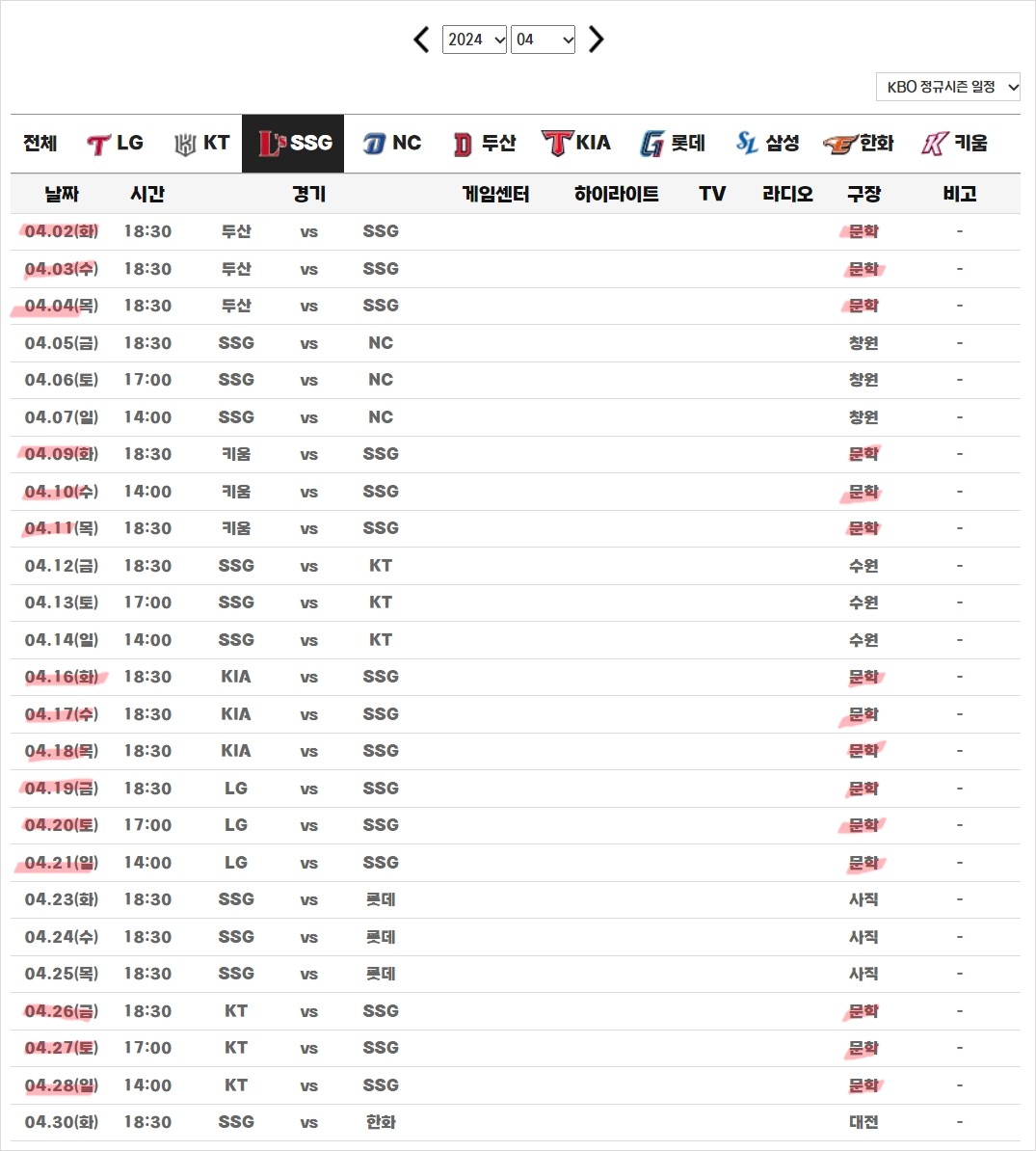 다음으로는 SSG 랜더스의 4월 경기 일정입니다. 문학, 창원, 수원, 사직, 대전 등에서 경기가 펼쳐질 예정이며