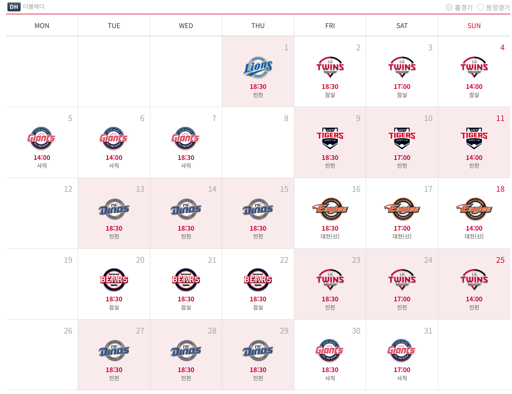 위의 5월 경기일정표에 보시면 빨갛게 칠해져 있는 부분이 홈경기를 표시한 부분입니다. 기아, NC, LG와 문학구장에서 홈팀으로서 경기를 펼칠 예정이에요.