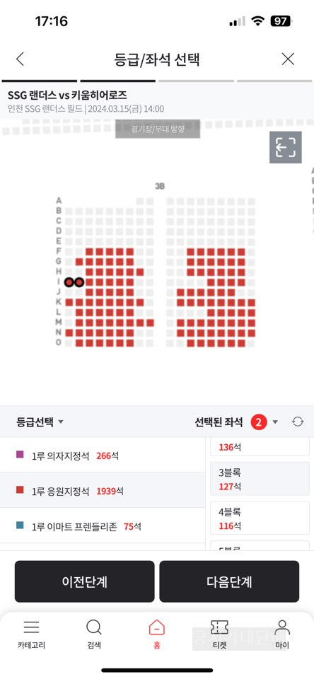 다음으로 진입하셨다면 원하는 좌석을 선택해주어야 합니다. 평일 시범경기여서 그런지 잔여 좌석이 많이 남아있는 걸 확인할 수 있었습니다.